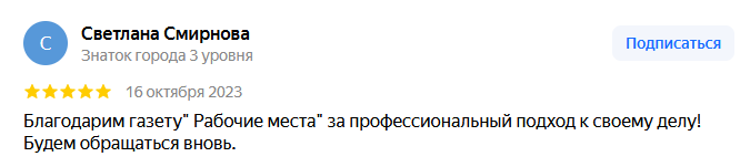 Вакансии в газете «Рабочие места» размещаем еженедельно (ООО ЕЛЛОУ ПЕЙДЖЕС ТЕЛЕКОМ открывает новый офис в Кирове и создает в связи с этим более 300 рабочих мест). Издание достаточно информативно. Для нас основные критерии – это большой тираж газеты и охват необходимой нам аудитории. Удобство в работе, т.е. это возможность узнавать о новых вакансиях города, как в печатном издании, так и на сайте https://www.gazeta-rm.ru/.
