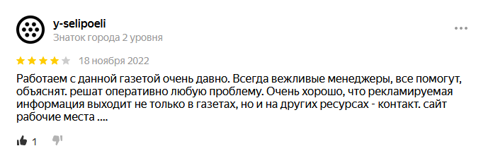 Работать с вами всегда удобно. Дизайн газеты довольно яркий, привлекающий соискателей. Размещаем вакансии по мере надобности, это зависит от сезона. Менеджер свои функции выполняет на отлично.